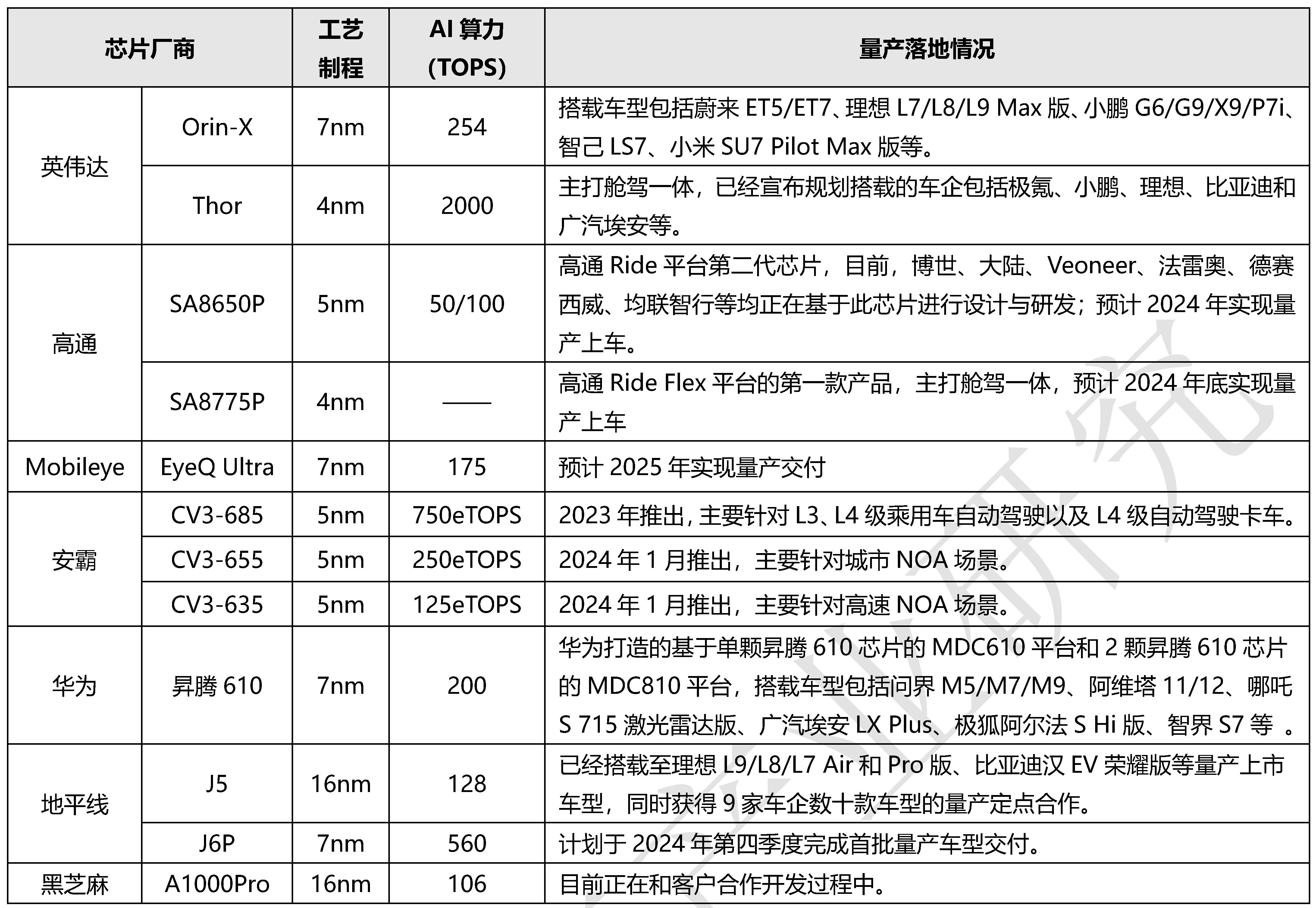 另外,在智能駕駛功能配置上,不同市場定位車型的智能駕駛方案對主控SoC芯片也存在不同層級的需求。目前,參考不同級別智駕方案對主控SoC芯片在AI算力需求上的不同,智駕SoC芯片可大致分為三種類型:小算力SoC芯片(2.5~20TOPS)、中算力SoC芯片(20~80TOPS)和大算力SoC芯片(≥100TOPS)。