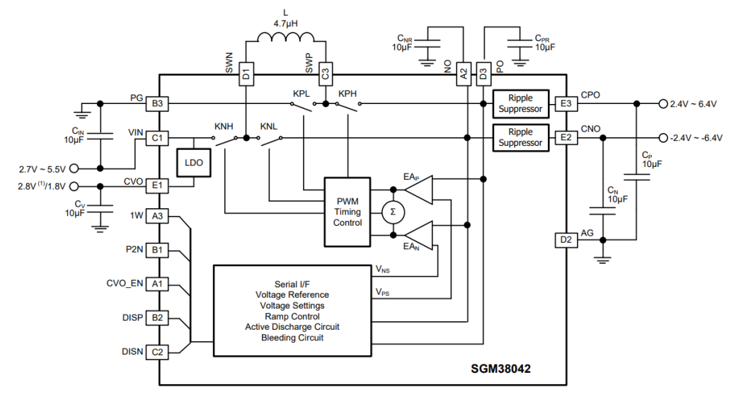 圣邦微推出的SGM38045芯片,包括一個(gè)1×/1.5×電荷泵和 一個(gè)-1×反向電荷泵,由2.7V~4.8V輸入電壓生成所需的三個(gè)電源軌輸出: